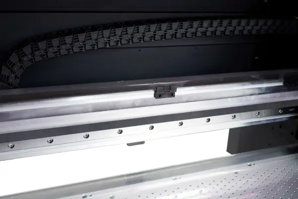 Heavy-duty guide rail system enhances stability and printing accuracy. This UV DTF printer ensures smooth carriage movement for high-speed, high-quality production.