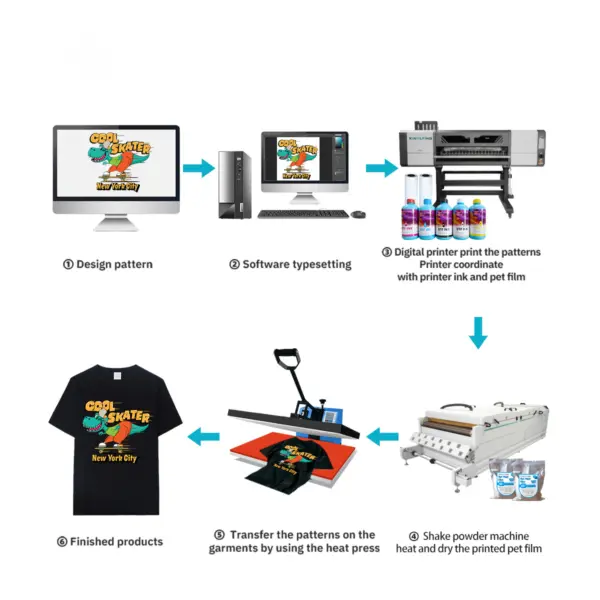 Percetakan pendarfluor DTF, debu, Mengeringkan keseluruhan proses pemprosesan operasi bersepadu, penggulungan automatik.