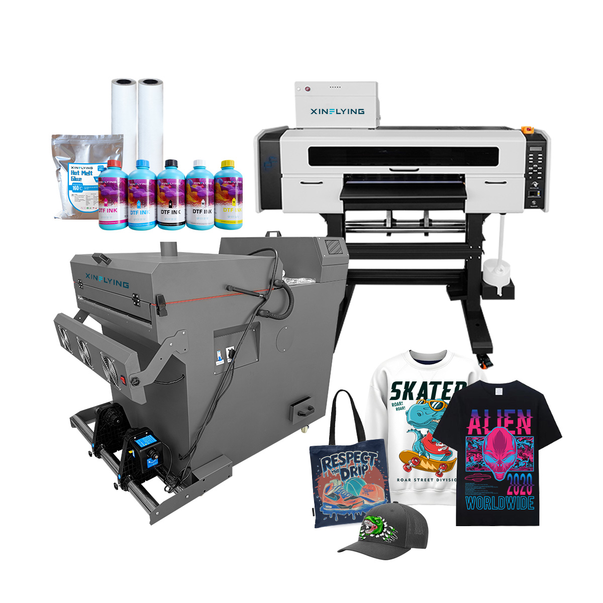 Utöka ditt företag med en komplett, helt integrerad DTF-utskriftslösning. Från professionella DTF-skrivare och automatiserade värmeöverföringssystem till högkvalitativa förbrukningsvaror, Xinflygning ger allt du behöver för att lansera och skala din DTF-verksamhet med förtroende.